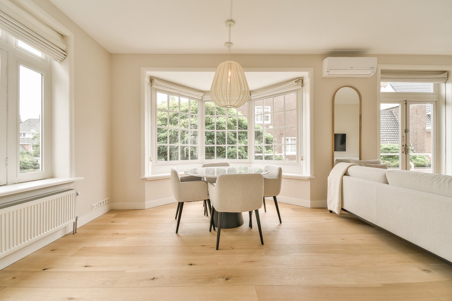 The living room with bay window has windows at the front, rear and side, making the living room very bright. The living room is very luxurious and modern and has a beautiful oak herringbone floor. The living room has air conditioning.