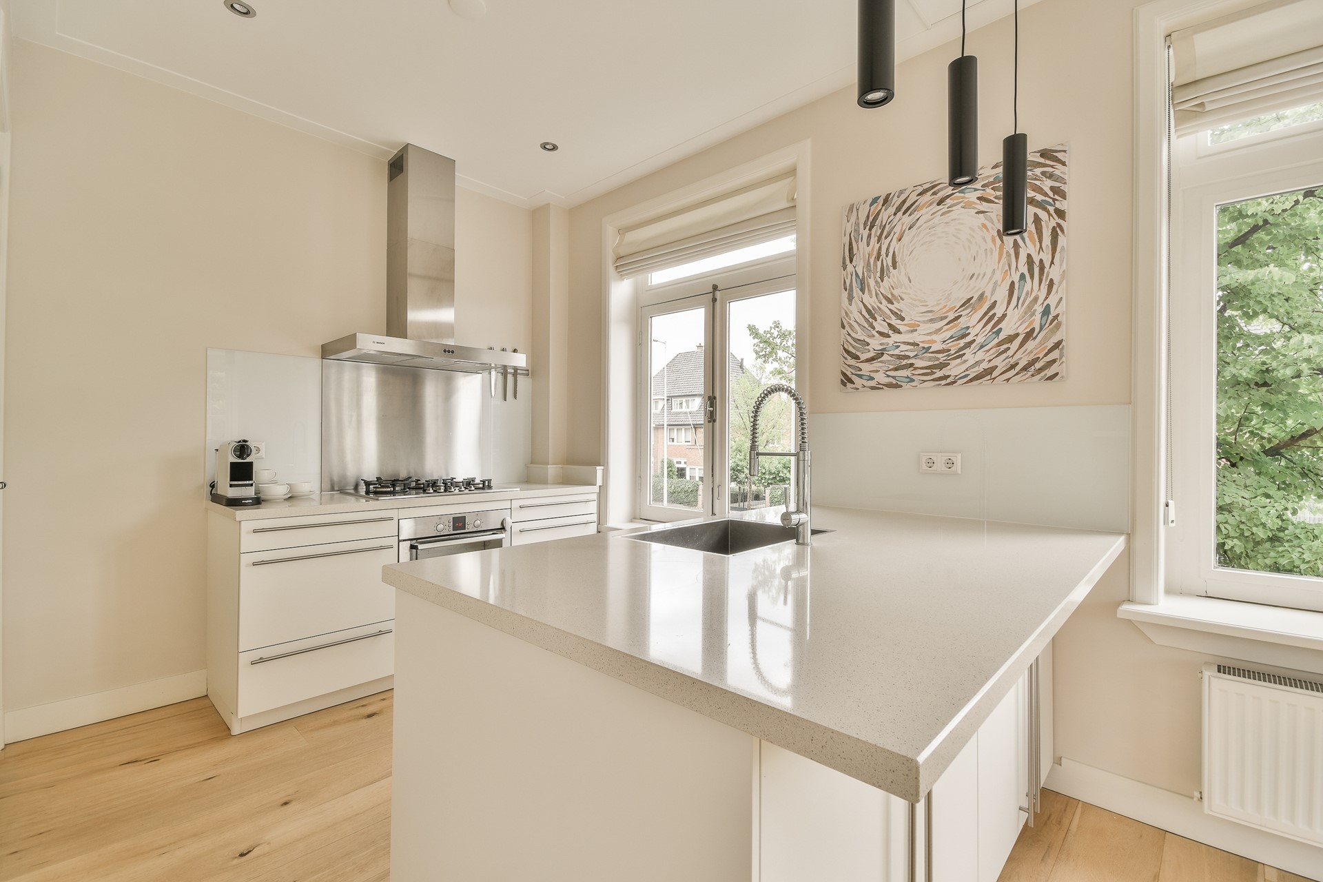 The beautiful high-gloss white open kitchen with island is equipped with a dishwasher, refrigerator, 5-burner gas hob, oven and extractor hood. There is a large freezer in the pantry.
