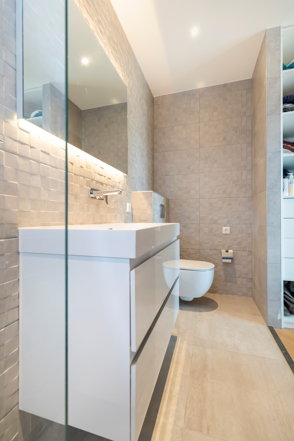 De grote slaapkmer heeft een groot tweepersoonsbed en een inloopkast. Tevens bevindt zich ensuite aan deze slaapkamer een luxe badkamer met douche, wastafel en toilet.