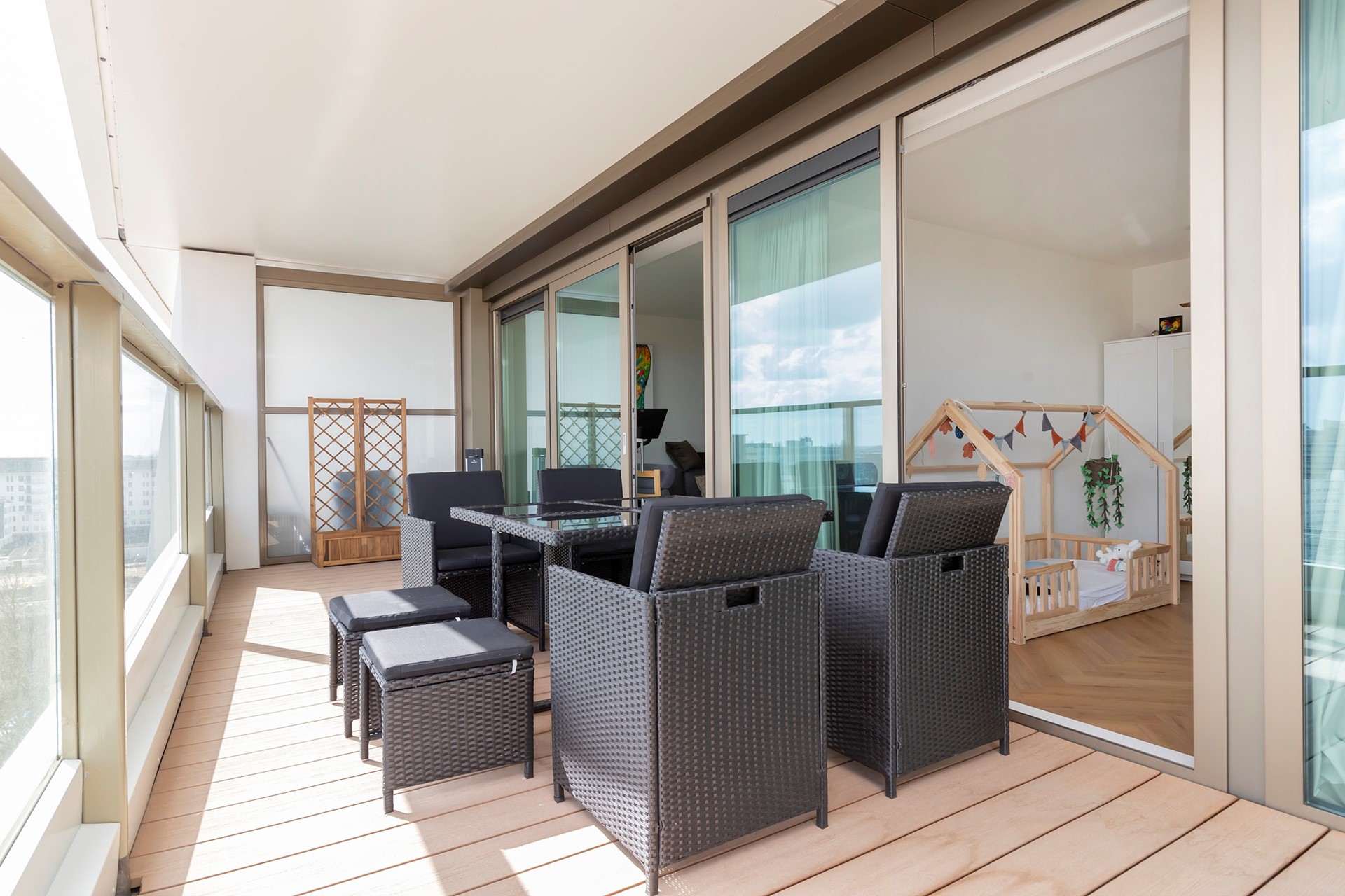 Via de schuifpuien komt u vanuit de woonkamer en beide slaapkamers op het ruime terras van circa 25m2.