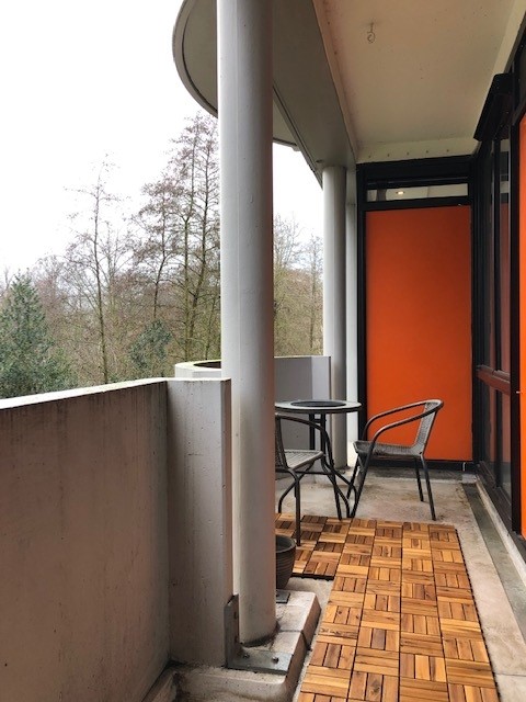 Aan de voorzijde bevindt zich een ruim balkon met uitzicht over water en groen. De twee slaapkamers en de woonkamer geven toegang tot het balkon.