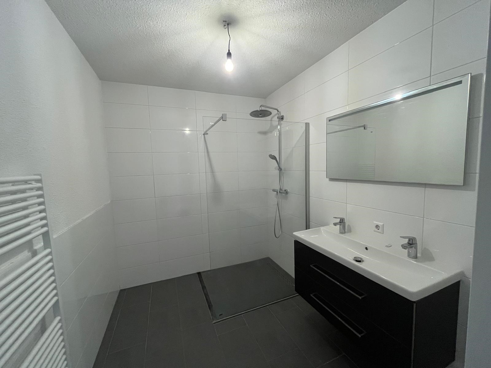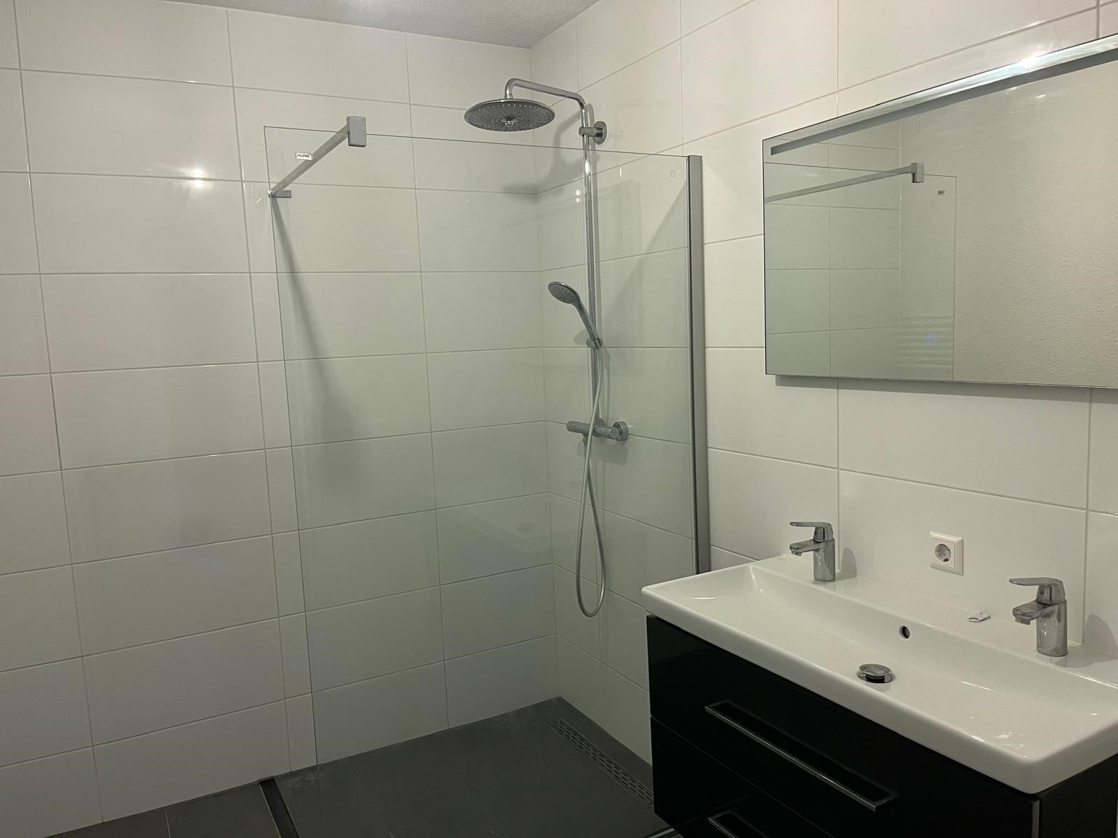 De badkamer heeft een wastafel, wastafelmeubel, toilet en douche.