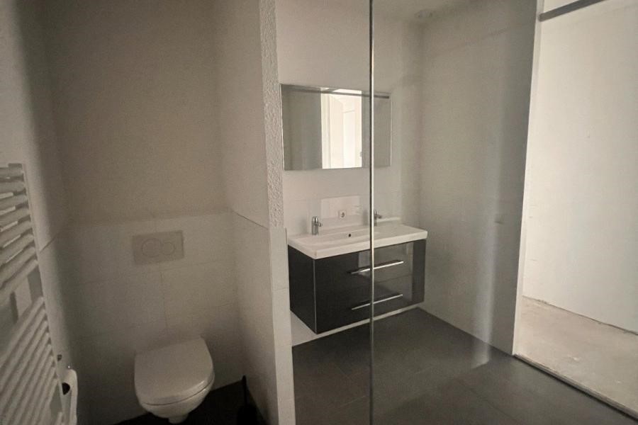 De badkamer heeft een wastafel, wastafelmeubel, toilet en douche.