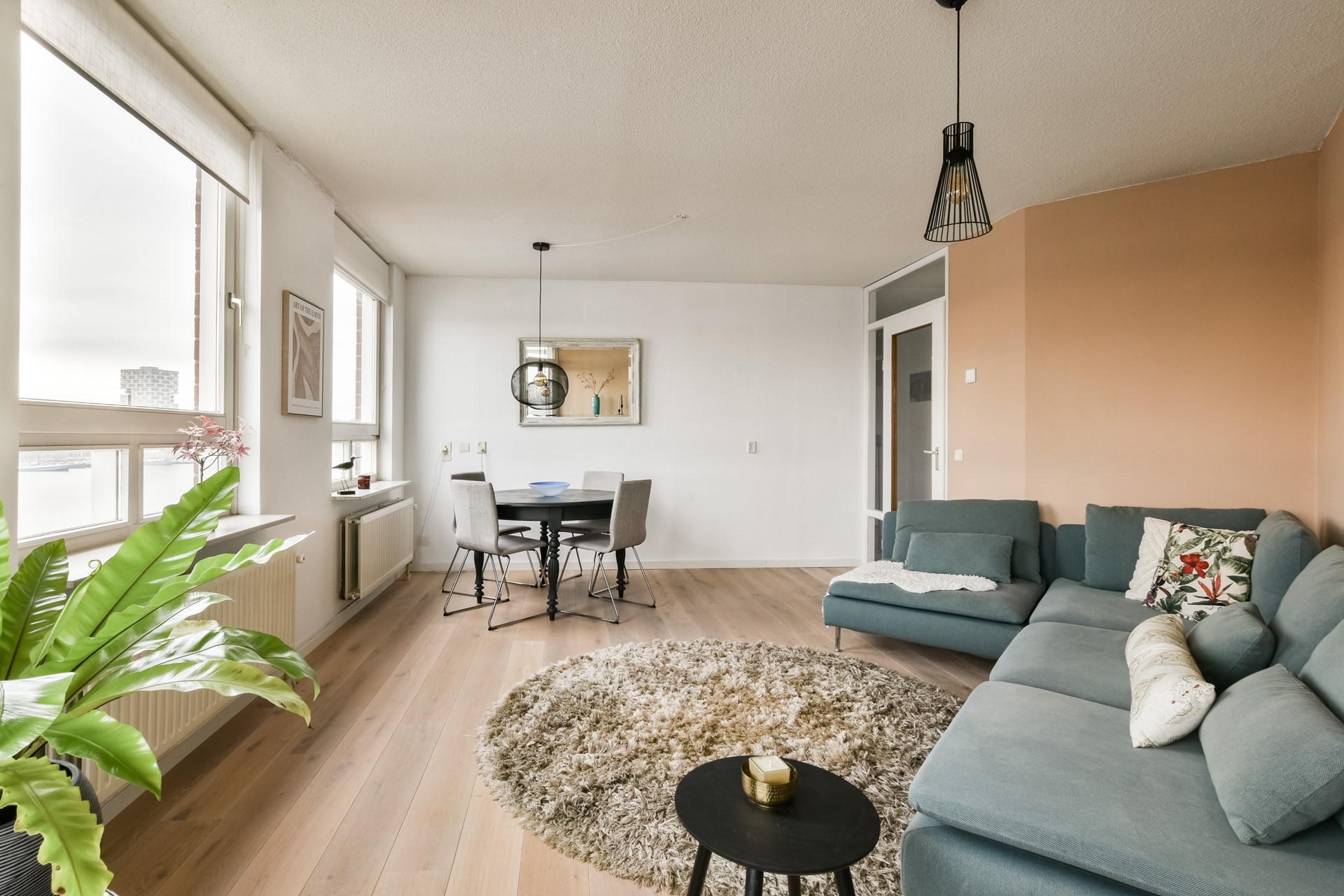De ruime en lichte woonkamer biedt voldoende plek voor een comfortabele zithoek en eethoek. Dankzij de praktische indeling is de ruimte eenvoudig in te richten en prettig om in te verblijven. Daarnaast heeft de woonkamer vrij uitzicht over het water. De woonkamer geeft toegang tot het balkon.